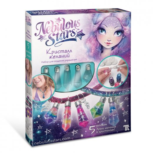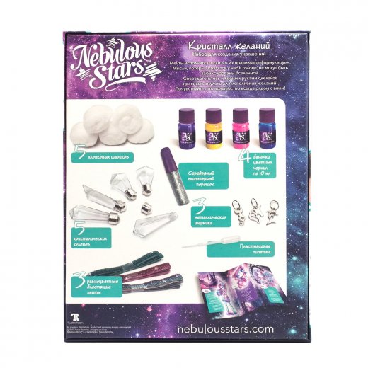 Состав набора: 5 кулонов в форме кристаллов, серебряный глиттер, 4 баночки чернил по 10 мл, 3 металлических шарма, 3 блестящих ленты, 5 хлопковых шариков, пластмассовая пипетка, инструкция, история звезды Небулии.