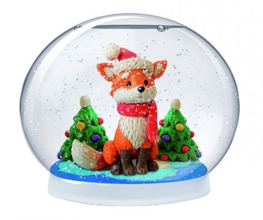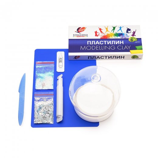 Состав набора: подробная инструкция, сферическая основа для шара, фигурная подставка для сувенира, цветной пластилин, доска для лепки, специальная жидкость, два вида блесток для создания снежного эффекта