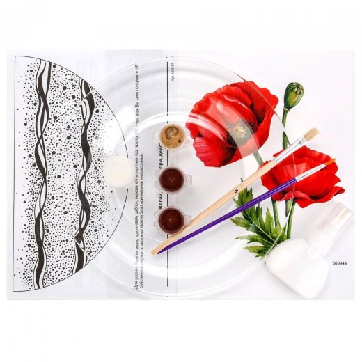 В комплекте представлена инструкция с подробным описанием процесса нанесения на тарелку декупажной карты, а также ее наклеивания. Детям останется лишь аккуратно покрыть готовое изделие безопасным лаком, чтобы оно долгое время оставалось ярким и красивым. В результате получится яркая тарелка с изображениями цветущих красных маков на фоне изящных узоров. Ребенок может поставить поделку на полочку в своей комнате или повесить ее на стену, предварительно дополнив специальной петелькой (не входит в набор).