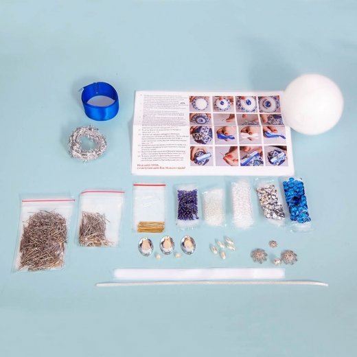 Состав набора: пенопластовый шар, бархатная и атласная ленты, декоративная тесьма, шнур, пайетки, бусины, бисер, стразы, гвоздики-булавки, филигранные элементы, выкройка, пошаговая инструкция с фото.