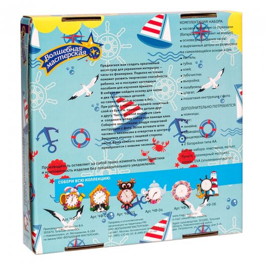 Набор для детского творчества Волшебная мастерская «Часы. Морские» – это сборная модель, в результате работы над которой ребёнок создаст удивительно красивые часы. Часы оснащены настоящим действующим часовым механизмом, поэтому они не только украсят комнату своим неповторимым дизайном, но и будут весьма полезны. Всё необходимое для создания часов из фоамирана включено в комплект набора. Используя подробную пошаговую инструкцию, будет легко справиться с этой интересной творческой работой и она обязательно доставит бурю эмоций и позитива!