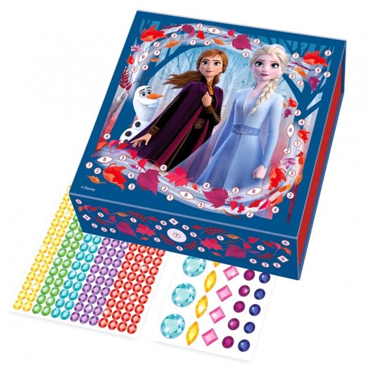 В состав набора, кроме самой коробочки, входят 217 блестящих прозрачных страз 8 цветов и разных размеров. Стразы снабжены клеевым слоем и легко переносятся с блока хранения на шкатулку без клея и каких-либо специальных инструментов. Места приклеивания страз выделены согласно размера и цвета страз, поэтому их практически невозможно приклеить «не туда», а места под мелкие стразы имеют номера, соответствующие цвету. Таблица соответствия номеров цветам располагается на упаковке вместе с изображением законченного изделия. В итоге, ребенок становится обладателем красивой шкатулочки со стразами «Холодное сердце», сделанной своими руками.