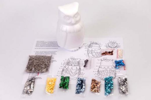 Состав набора: пенопластовая заготовка, гвоздики, пайетки.