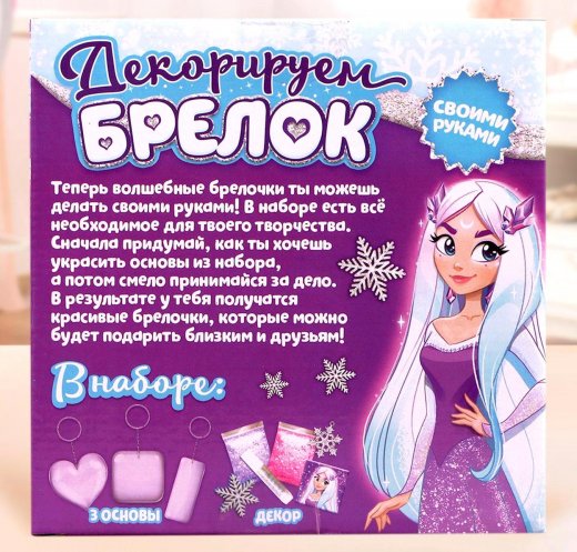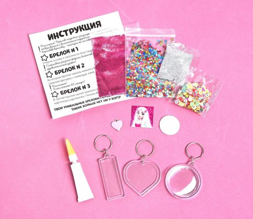 Состав набора: 3 брелока, клей, 3 пакетика с разными блестками, наклейки, картонные элементы, вкладка, шарм, игрушка.