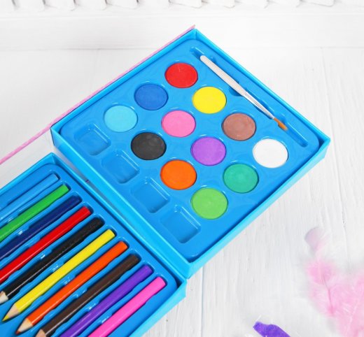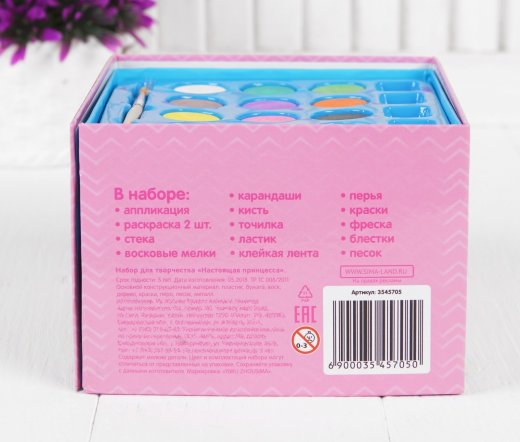 Состав набора: 2 раскраски, краски акварельные 12 шт., цветные карандаши 10 шт., восковые карандаши, 10 шт., кисть, точилка, ластик, фреска, 9 цветов песка по 2 грамма, блёстки серебро (пакетик 2 гр), стека пластиковая для фресок, аппликация из перьев, набор перьев, лист разноцветных страз.