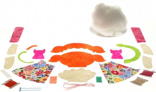 Состав набора: вырезанные детали, разноцветная ткань для платья, 3 катушки ниток, кружевная лента, 2 иглы, набивка.
