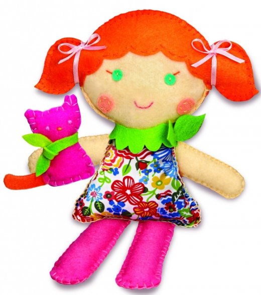 Набор Школа шитья Кукла и котенок – идеальный набор для первого знакомства с миром шитья. Благодаря ему юная рукодельница научится выполнять 3 вида базовых швов и изготовит своими руками очаровательную куклу с милым котенком. Фетровые детали куклы уже выкроены и вырезаны, что значительно облегчает задачу для новичка. На деталях имеются отверстия для швов, благодаря которым все стежки получатся ровными и аккуратными.