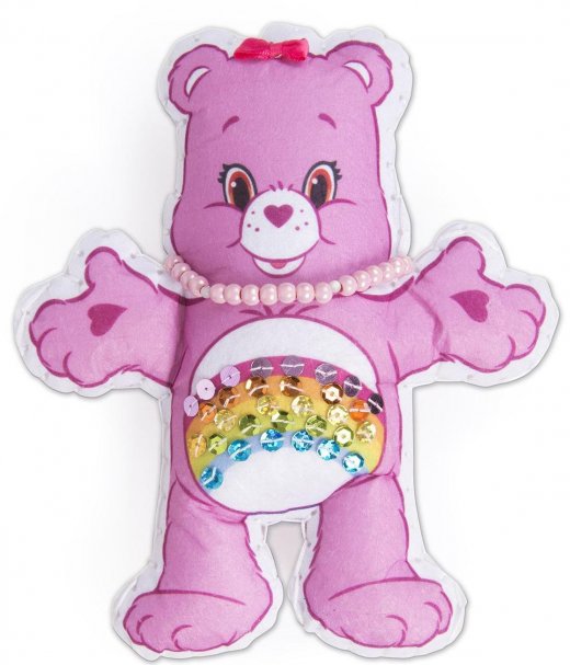 Состав набора: фетровые детали с нанесенным рисунком и перфорацией для стежков, пластиковая безопасная иголка, пуговка-носик, пуговка-сердечко, 5 цветов пайеток (голубые, розовые, зеленые, оранжевые, желтые), бантик, набивка, нитки.