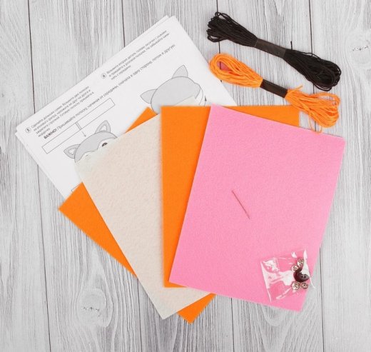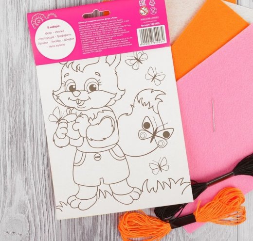 Состав набора: фетр, иголка, инструкция, трафареты, пуговки, кнопки, шнурок, нитки мулине, раскраска.