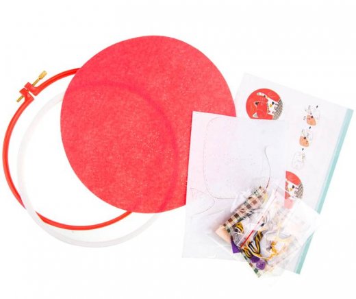 Состав набора: пяльцы-рамка, детали из фетра и ткани, пуговицы, нитки, игла, ленты, инструкция.