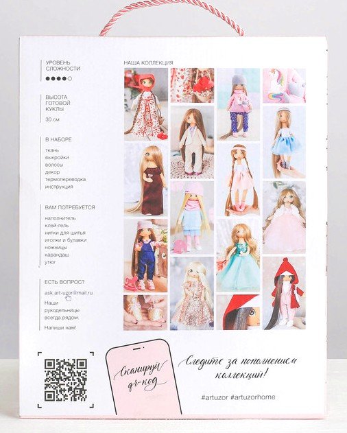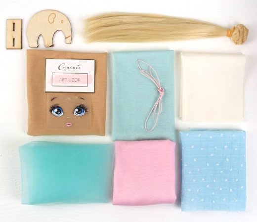 Состав набора: ткань, выкройки, декор, волосы, термопереводка, инструкция. (Дополнительно вам понадобятся наполнитель, клей-гель и нитки).