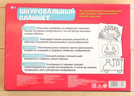 Шнуровальный планшет — это занимательная развивающая игра, которая надолго увлечёт малыша. Резиновые мембраны на отверстиях позволяют быстро составлять изображение и также быстро вынимать шнурки обратно. Благодаря 8 ярким шнуркам длиной 80 см картинки получаются полноценными и разнообразными. Пластиковая ручка помогает удобно фиксировать шнурки на планшете и создавать объёмные изображения. Большой размер планшета даёт возможность создавать целые картины.