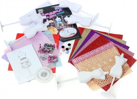 Состав набора: швейная машинка с ножным приводом, 6 пластмассовых манекенов, комплект из 40 булавок, 10 образцов ткани, 3 катушки ниток, стразы, иголка, 6 выкроек, блокнот с эскизами моделей, инструкция по эксплуатации швейной машины.