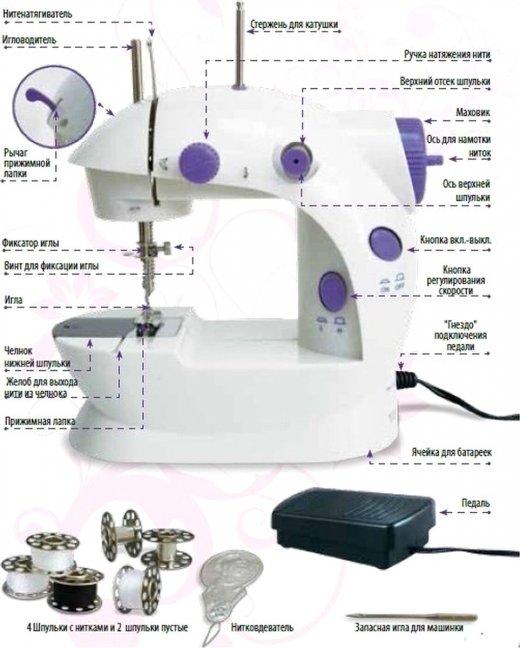Швейная машинка работает от 4 батареек типа АА (в набор не входят).