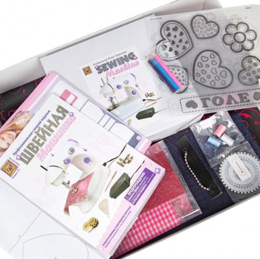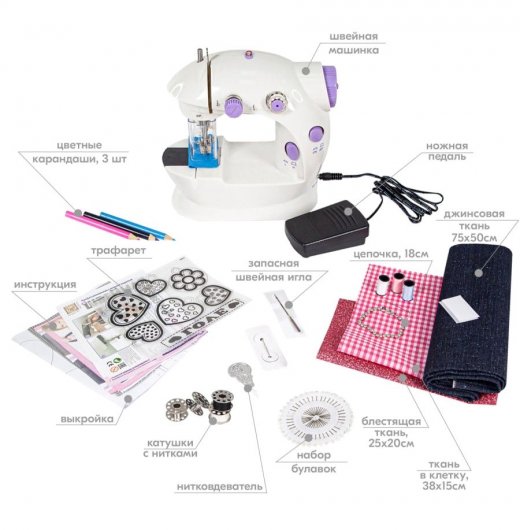 Состав набора: швейная машинка, 4 шпульки с нитками (30 м), нитковдеватель, запасная игла для швейной машинки, педаль, 2 шпульки, джинсовая ткань, ткань в клетку, блестящая ткань, трафарет с подвесками, 3 цветных карандаша, металлическая цепочка (18 см), 3 катушки ниток (27 м), диск с булавками (40 шт.), игла, 1 застежка-липучка (из двух лент: петельной и крючковой), выкройки.