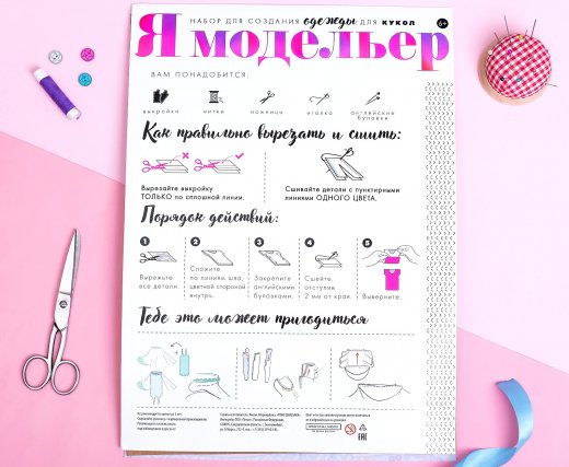 Набор «Я модельер» — настоящий клад для юной модницы! Девочки с лёгкостью смастерят дизайнерские наряды на свой вкус как профессиональные кутюрье. В набор входят лекала будущей одежды, ткань и инструкция с основами швейного мастерства. Чтобы получить красивый наряд, нужно вырезать все детали по линии среза, затем сложить одинаковые части лицевой стороной внутрь, закрепить их булавками. Сшить детали, отступив от края 2 мм, вывернуть. Наряд готов!