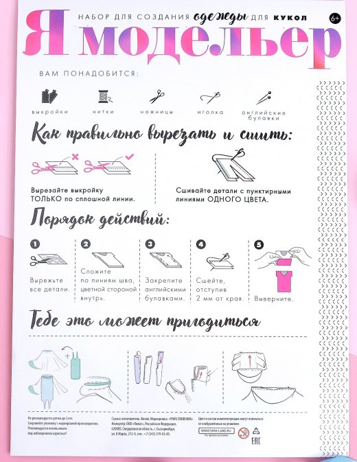 Набор «Я модельер» — настоящий клад для юной модницы! Девочки с лёгкостью смастерят дизайнерские наряды на свой вкус как профессиональные кутюрье. В набор входят лекала будущей одежды, ткань и инструкция с основами швейного мастерства. Чтобы получить красивый наряд, нужно вырезать все детали по линии среза, затем сложить одинаковые части лицевой стороной внутрь, закрепить их булавками. Сшить детали, отступив от края 2 мм, вывернуть. Наряд готов!