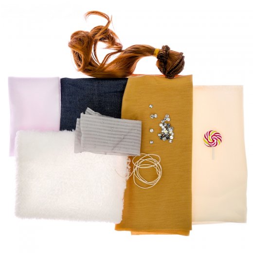 Состав набора: ткань, выкройки, волосы, декор, инструкция. (Дополнительно вам понадобятся наполнитель, нитки, иголка и булавки, клей-гель).