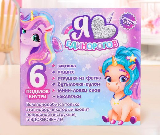 Все наборы из серии «Я люблю» представляют собой мегакомплекты с 6 поделками внутри. Состав набора разработан исходя из предпочтений ребёнка. В серии есть 4 темы: единороги, ламочки, русалки и феечки.
