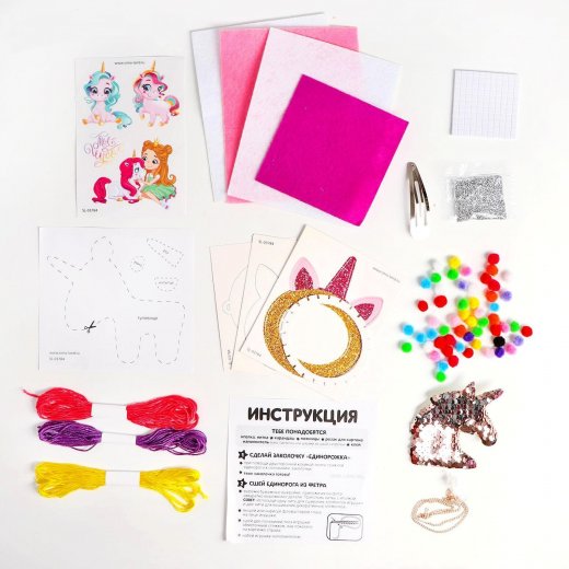 Состав набора: подробная инструкция ко всем поделкам, выкройки, фетр, различный декор по тематикам (мягкие шарики, стразы, ниточки, ленточки), картонные основы, наклейки по тематике, двусторонняя клейкая лента, баночка для изготовления кулона, основа для заколки, блестки, мягкая мини-игрушка для поделки.