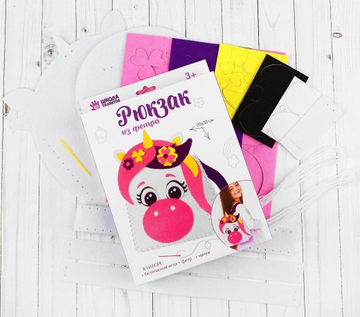 Ваша маленькая модница будет в восторге, ведь теперь она сама сможет стать дизайнером и сшить рюкзак! Выберите понравившийся набор и вместе с малышом создайте рюкзачок из фетра. Если вам кажется это сложным для ребенка, то спешим уверить в обратном, все просто! Ведь такой набор предусмотрен для детей от 3 лет, у рюкзака есть перфорация и клеевой фетр, он легко сшивается пластиковой иглой. Материалы безопасны для ребенка, чтобы выполнить такую поделку, достаточно следовать инструкции на обороте. Добавьте немного креатива и наслаждайтесь уютным времяпровождением.