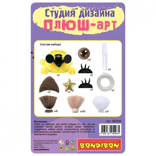 Внутри Вас ждет все, что нужно для создания милой игрушки: основа, глаза, реснички, ушки, звездочка, кисточки, клей, скотч и наклейки.