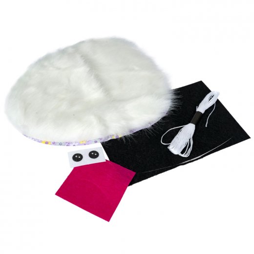 В швейном наборе - части игрушки из хб ткани, искусственного меха и фетра, наполнитель, нитки, безопасная игла, пластиковые пуговки глазки, инструкция.
