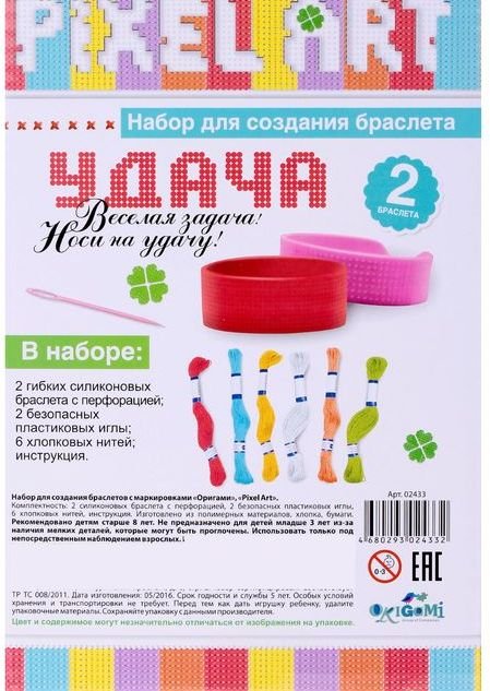 Набор для создания браслета Удача – послужит замечательным подарком для девочки, которая любит делать украшения своими руками. Набор для творчества Pixel Art от компании Origami состоит из двух заготовок для браслетов, которые юная стилистка сможет закончить самостоятельно, используя для этого цветные нитки, а также свою фантазию и воображение.