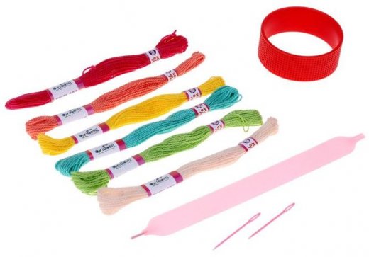 Состав набора: 2 гибких силиконовых браслета с перфорацией, 2 безопасные пластиковые иглы, 6 хлопковых нитей.