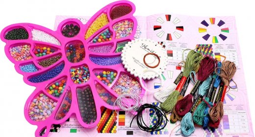 Состав набора: бисер разноцветный, кристаллы разноцветные, бусины разноцветные, леска, станок для плетения жгутов "Кумихимо", набор разноцветных ниток мулине, застежки-закрутки, замок-карабин, проволока, пошаговая инструкция-схема.