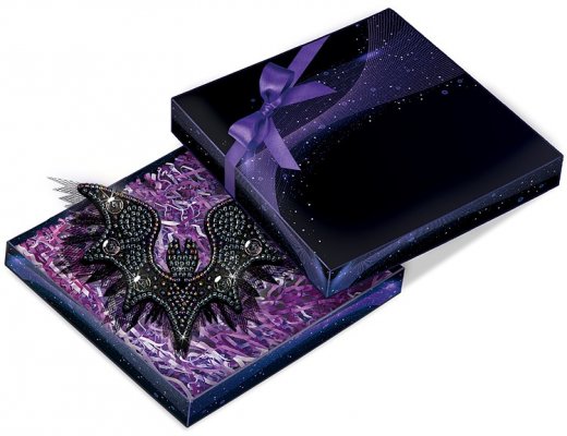Патч, стилизованный под ювелирное украшение в форме летучей мыши, вышитый сверкающим бисером и пайетками на фетре, с декором из фатина, будет прекрасно смотреться как украшение на вечернем платье и как подарок в красочной коробке с декоративным наполнителем.
