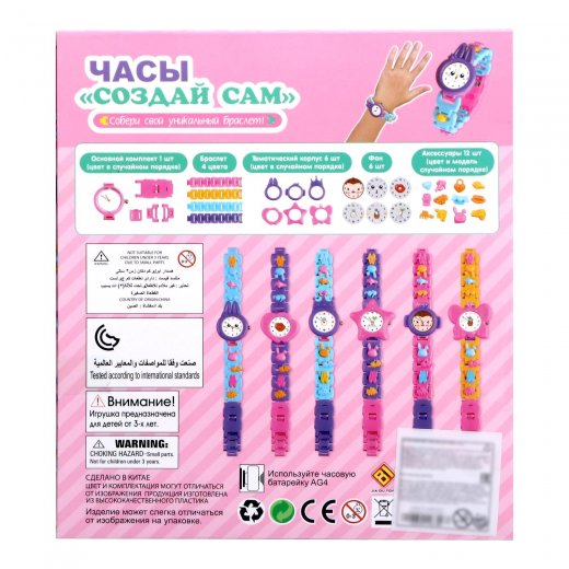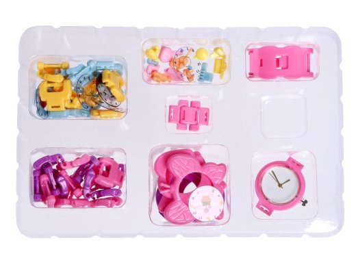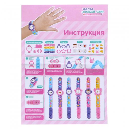 Соберите свой уникальный браслет-часы. С помощью этого набора можно собрать 2 разные модели браслета и часов. Маленькие модницы могут проявить всю свою фантазию с помощью забавных деталей на любой вкус. Наслаждайтесь процессом создания своих уникальных часов.