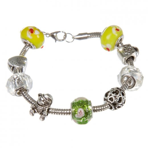 Модные, красивые и нарядные браслеты с шармами вызывают восхищение по всему миру! А теперь можно самостоятельно собрать невероятно красивый серебристый желто-зеленый браслет своими руками! В наборе разнообразные шармы, которые можно комбинировать по своему вкусу, а также основа - серебристый браслет-цепочка.