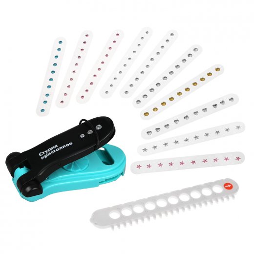 В комплект входят 100 страз разной формы и цвета, а также машинка для их наклеивания.