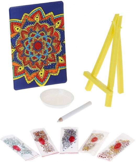 Состав набора: картинка с клейкой основой, стенд, стилус, тарелочка, более 1000 страз.