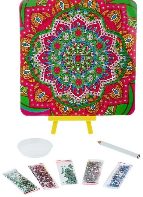 Состав набора: картинка с клейкой основой, стенд, карандаш-стилус, тарелочка, стразы.