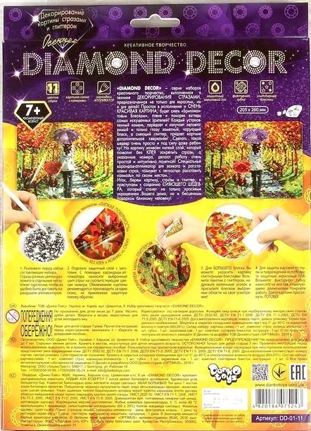 Набор для творчества Diamond Decor Осенняя пора – предлагает ребенку заняться оригинальным видом творчества. На картине запечатлен прекрасный парк с тропинкой и идущей по ней девушкой с ребенком, которая в процессе выполнения станет сверкать и переливаться разноцветными цветами. Сделать такой шедевр очень просто и под силу даже ребенку! На картину нанесен липкий слой, который позволит без клея закрепить стразы, а указанные номера, делают работу очень простой и интуитивно понятной! Специальный карандаш-аппликатор для захвата и расстановки страз, поможет с легкостью расставить «алмазы» по своим местам.