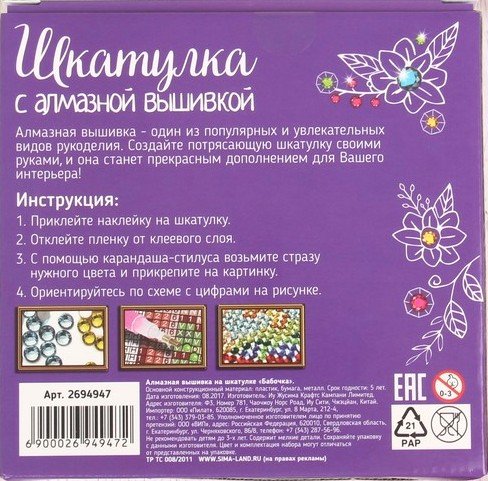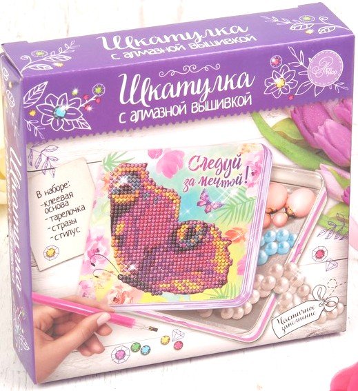 Состав набора: картинка-наклейка, стразы, поддон для страз, специальный карандаш, металлическая шкатулка, 14 х 14 см