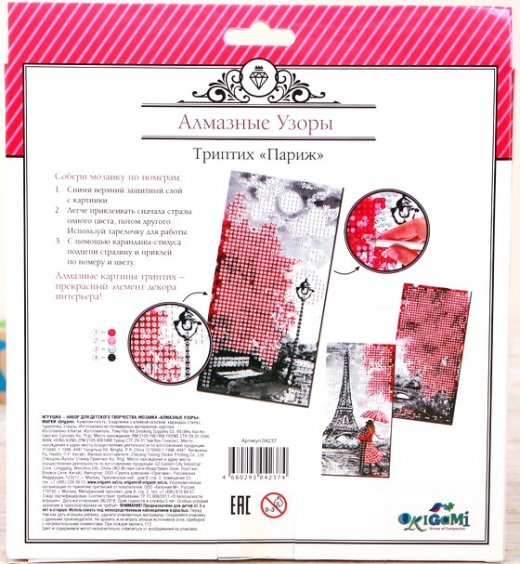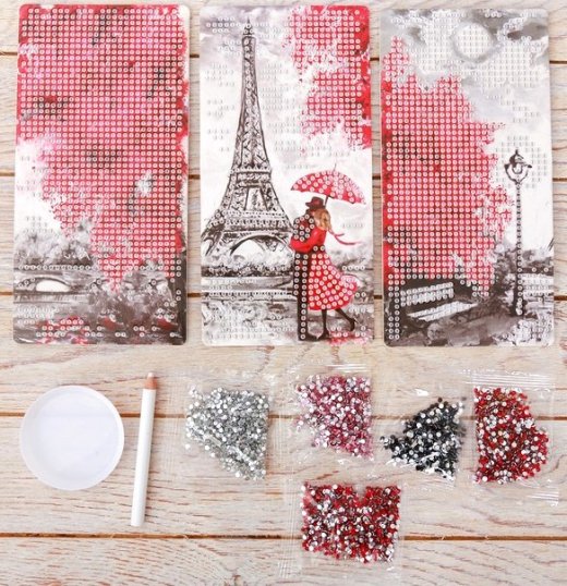 Мозаика Алмазные узоры Париж - это прекрасный подарок для юных любителей творчества и поделок своими руками. Окунитесь вместе со своим ребенком в мир творчества! Ребёнку предстоит собственноручно создать потрясающее произведение искусства, сделать это весьма просто, но очень интересно. Алмазный триптих Париж представляет собой модульную картину, когда изображение разделено на три части, каждя из которых собирается и оформляется как отдельная картина. С помощью специального карандаша вам нужно разложить стразы по нарисованной схеме с обозначением необходимых цветов, полностью заполнив полотно.
