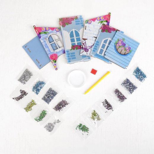 - Возьмите детали домика со схемой для алмазной вышивки. Откройте небольшой участок схемы, приподняв и отогнув защитный слой. Чтобы вязкость клеевого состава не снижалась, лучше не открывать всю схему сразу. Возьмите ёмкость и отсыпьте в неё немного деталей нужного цвета (номер на схеме соответствует номеру пакетика).