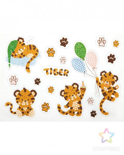 Набор Алмазная вышивка Озорные тигрята по изготовлению наклеек в технике Кристальная мозаика. Выполнение работы не требует специальных навыков, выкладывать стразами изображение очень просто и легко. Стразы наклеиваются поверх изображения со схемой на уже нанесенный клеевой слой. Готовые наклейки со стразами можно наклеить на любую ровную и гладкую поверхность В набор " Алмазная вышивка Озорные тигрята " входит: - один лист с несколькими небольшими наклейками, с напечатанными на них схемами для приклеивания страз и клеевым слоем с защитной плёнкой, - картонный лоток, - стилус и восковая подушечка,- круглые стразы,- инструкция.