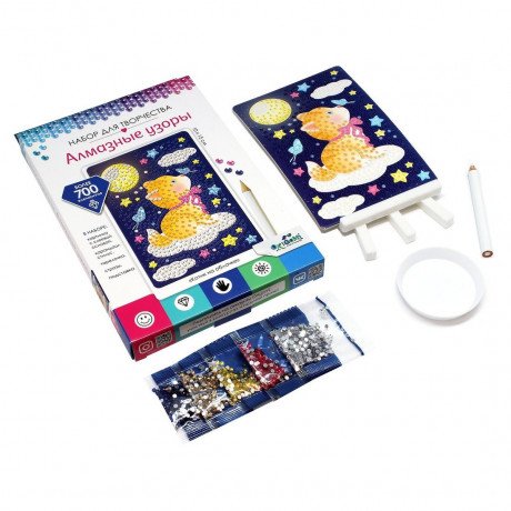Алмазные узоры Котик на облачке порадует всех юных поклонников творчества! Задача ребёнка – сделать красочную картинку ещё более эффектной, задекорировав её сверкающими разноцветными стразами. Котик на облачке станет прекрасным гостем в детской комнате. Ребенок самостоятельно сможет украсить картинку блестящими алмазами и составить из них картину или подарить друзьям! В наборе: картинка 10х15см с клеевой основой, стразы, подставка, тарелочка, карандаш-стилус.
