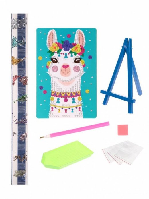 Алмазная мозаика «Лама» порадует всех юных поклонников творчества! Задача ребёнка – сделать красочную картинку ещё более эффектной, задекорировав её сверкающими разноцветными стразами. В комплекте – картонная основа с рисунком размером (ДхШ) 10х15 см, стразы, инструмент для наклеивания страз, подставка и ёмкость для страз.