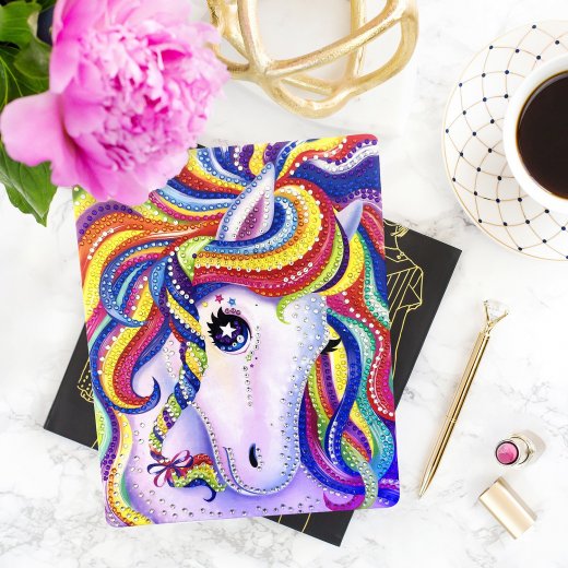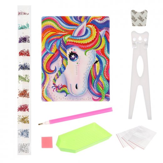 Техника работы с набором "Радужная лошадка" из серии "Алмазная мозаика" достаточно проста и поэтому доступна для всех юных любителей творческий поделок! Снимая шаг за шагом защитное покрытие, разноцветные стразы переносятся на картинку с липкой основой при помощи специального инструмента.