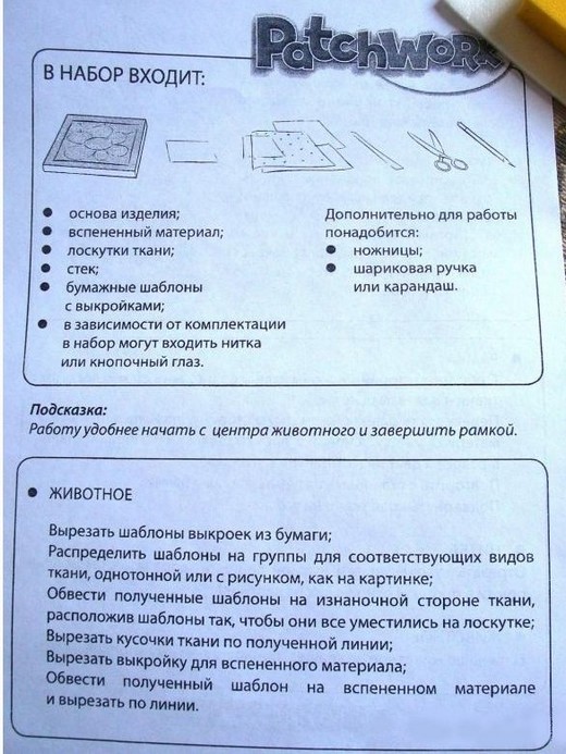 Состав набора: основа из ЭВА, вспененный материал, лоскутки ткани разного цвета, стек, бумажные шаблоны с выкройками..
