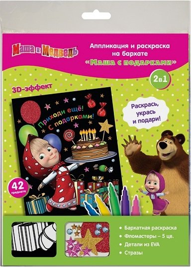 Аппликация на бархате Маша с подарками – станет замечательным подарком для девочки. Вместе со своей юной рукодельницей создайте на бархате потрясающую картину с 3D-эффектом! Для этого на бархатной основе раскрасьте белые фрагменты 5-ю цветами фломастеров из набора. Украсьте поделку самоклеящимися стразами, блестящими деталями из мягкого материала ЭВА и цветами из фетра. Вы также можете использовать любые дополнительные материалы: клей, краски, цветные карандаши, фольгу, кусочки ткани и др.