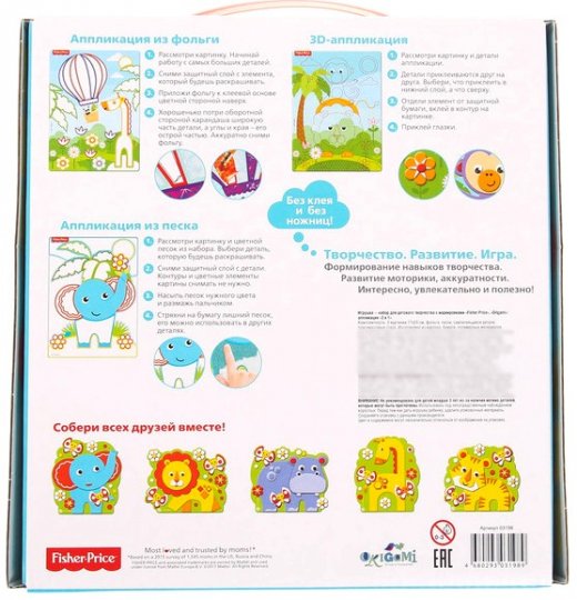 Набор аппликаций Зеленая страна – это замечательный подарок для любителя творчества. Набор для аппликации 3 в 1 позволяет без клея и ножниц создать 3 красочные картины с африканскими животными. Для создания 3D-аппликации используются картинки с изображениями льва, жирафа и слона, цветной песок, голографическая фольга и пластмассовые вращающиеся глазки.