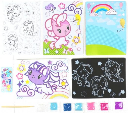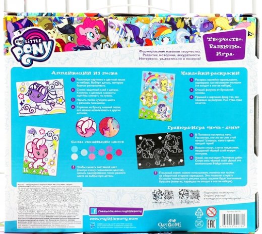 Набор для детского творчества Пони-малышки 4в1 – это прекрасный подарок для юных любителей творчества и поделок своими руками. С помощью набора для творчества My Little Pony ваша малышка легко сделает 4 веселые картинки в разных техниках. Это просто и безопасно, т.к. не нужно ни клея, ни ножниц. Делая две картинки из песка, экспериментируйте, смешивайте цвета для получения интересных цветовых эффектов. Раскрашивайте наклейки, делайте коллаж из них на картинке – фоне, или приклейте туда, куда хочется. Игра гравюра "ночь-день" поможет занятию быть не только увлекательным, но и полезным, развивая внимание и усидчивость.