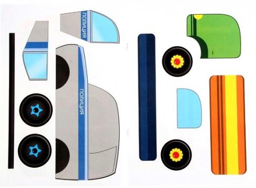 Удобные для наклеивания крупные детали, красочные. Бумага достаточно плотная, чтоб не съёжиться и не намокнуть сразу от клея, не смяться в руках. Наклеивается на отдельные листы картона, потом дорисовывается фон (дорога, светофор, водитель, деревья и т.д.) и получается сюжетная картина. В процессе наклеивания изучаются детали машин, придумывайте истории. Красочные аппликации помогут организовать досуг ребенка.