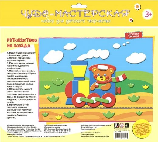 Аппликация "Путешествие на поезде" серии "Мягкая картинка" от бренда "Дрофа-Медиа" выполняется на основе с контурным изображением, которой следует придать цветового исполнения, с помощью специальных разноцветных деталей, имеющихся в комплекте. Цветные элементы выполнены из мягкого материала и покрыты клейким слоем, их нужно приложить к фрагментам основы, согласно образцу. В результате получается необычная мягкая аппликация, изображающая забавного медвежонка, выглядывающего из окна паровозика.